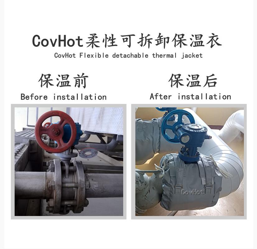 針對以上保溫問題,科好特科技COVHOT經(jīng)過不斷的努力,自主研發(fā)的柔性可拆卸式保溫套產(chǎn)品采用多種新型材料復合制成,在產(chǎn)品投入使用前,我們都會對材料選擇、外形設計、安裝方式、搭接方式進行全方位考究。