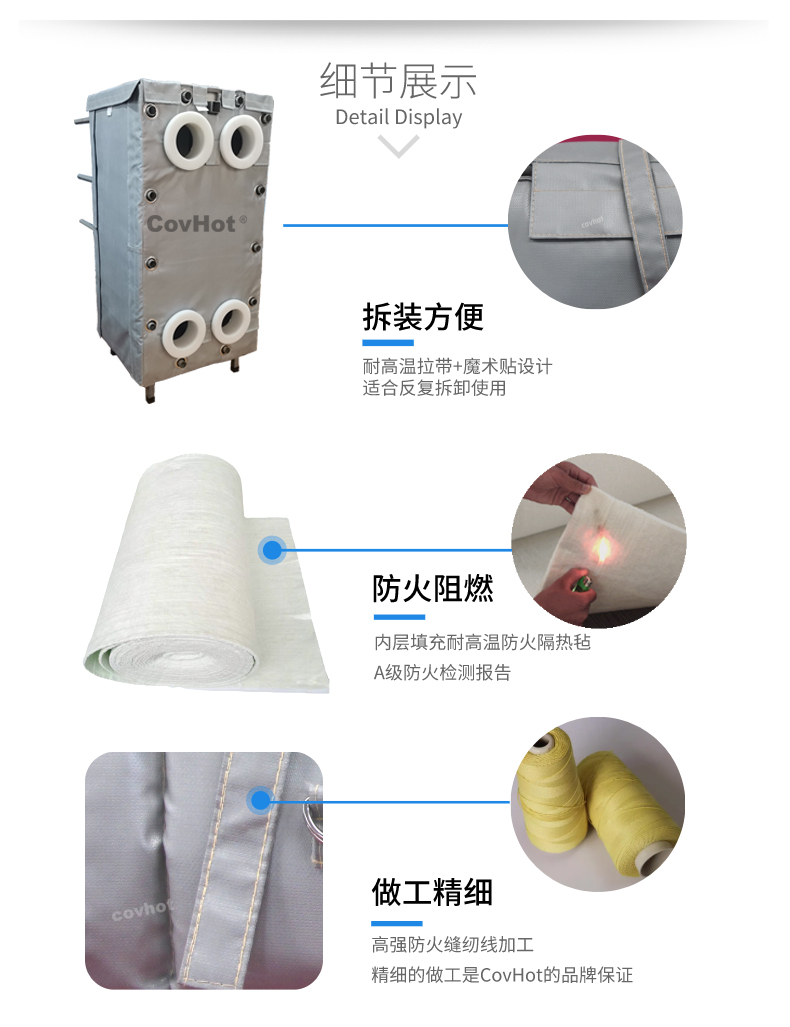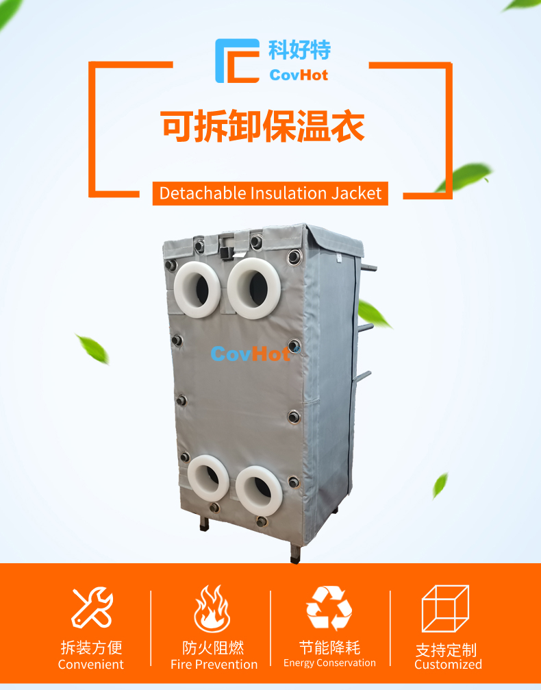 針對以上的問題,河北科好特科技有限責任公司自主研發(fā)的節(jié)能型板換保溫衣,可以有效減少換熱器的熱量損耗,而且在施工過程中安裝拆卸方便,節(jié)省人工,可拆卸保溫衣還可重復使用,起到節(jié)能降耗的效果。科好特可拆卸保溫衣根據(jù)設(shè)備不同的尺寸形狀量身定制,可廣泛用于換熱器、閥門、管道及其它需要保溫或防凍的領(lǐng)域。
